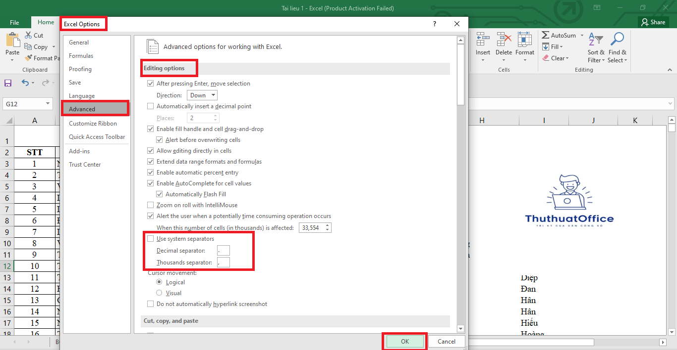 Excel cho phép người dùng tinh chỉnh các ký tự phân tách ngay trong phần cài đặt. Các bước thực hiện như sau:
