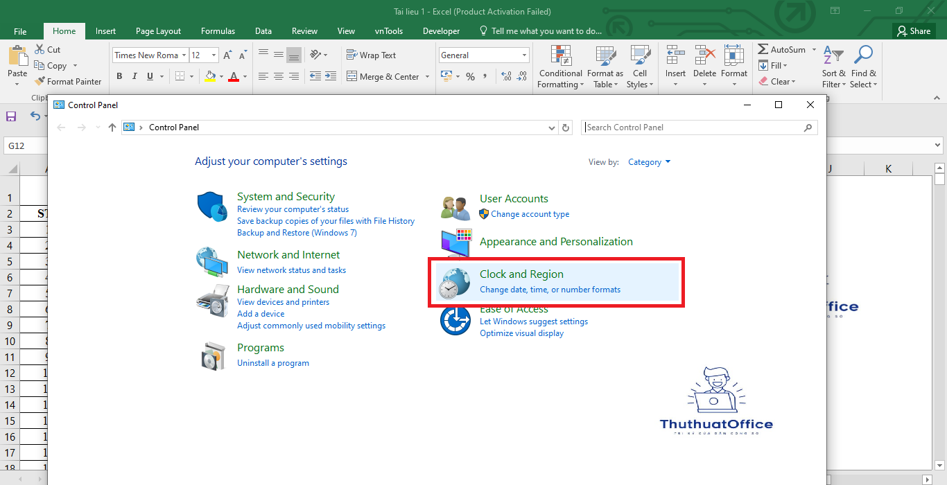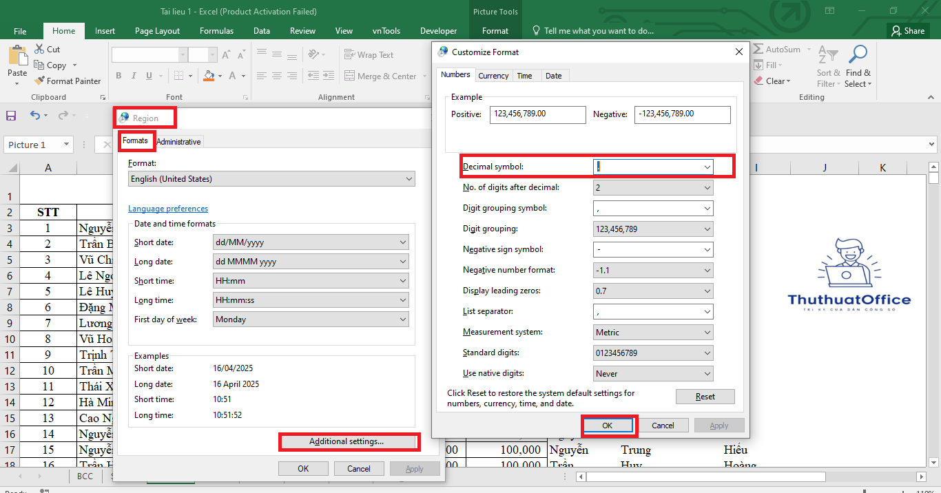 Đôi khi Excel lấy ký hiệu phân tách thập phân từ cài đặt hệ điều hành Windows. Vì vậy, bạn có thể đổi trực tiếp trong Windows để đồng bộ hóa giữa các ứng dụng: