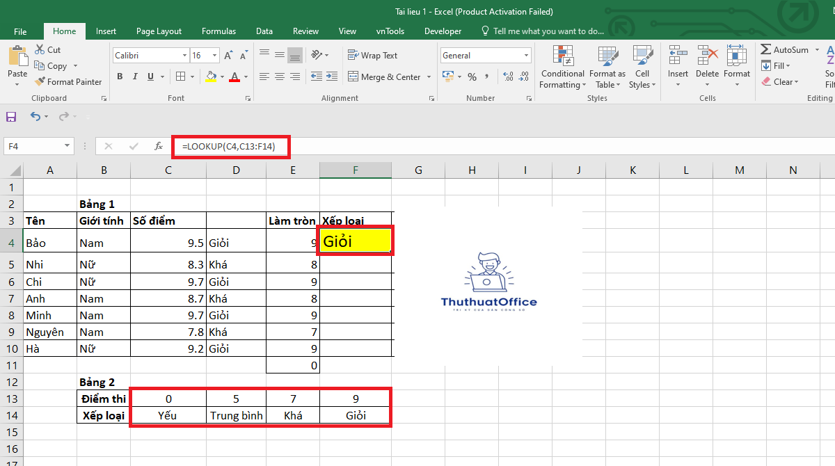 LOOKUP: Hàm tìm kiếm cơ bản, sử dụng cho trường hợp dữ liệu được sắp xếp theo thứ tự tăng dần.